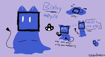 (my homestar runner self insert! this is bixby, they're a computer, and their body is made of this weird liquid. (it came from a computer bubs "accidentally" left by some radioactive goo he had lying around. as you do) they are very much cat-esque and despite the lack of a mouth can and will talk your ear off!)